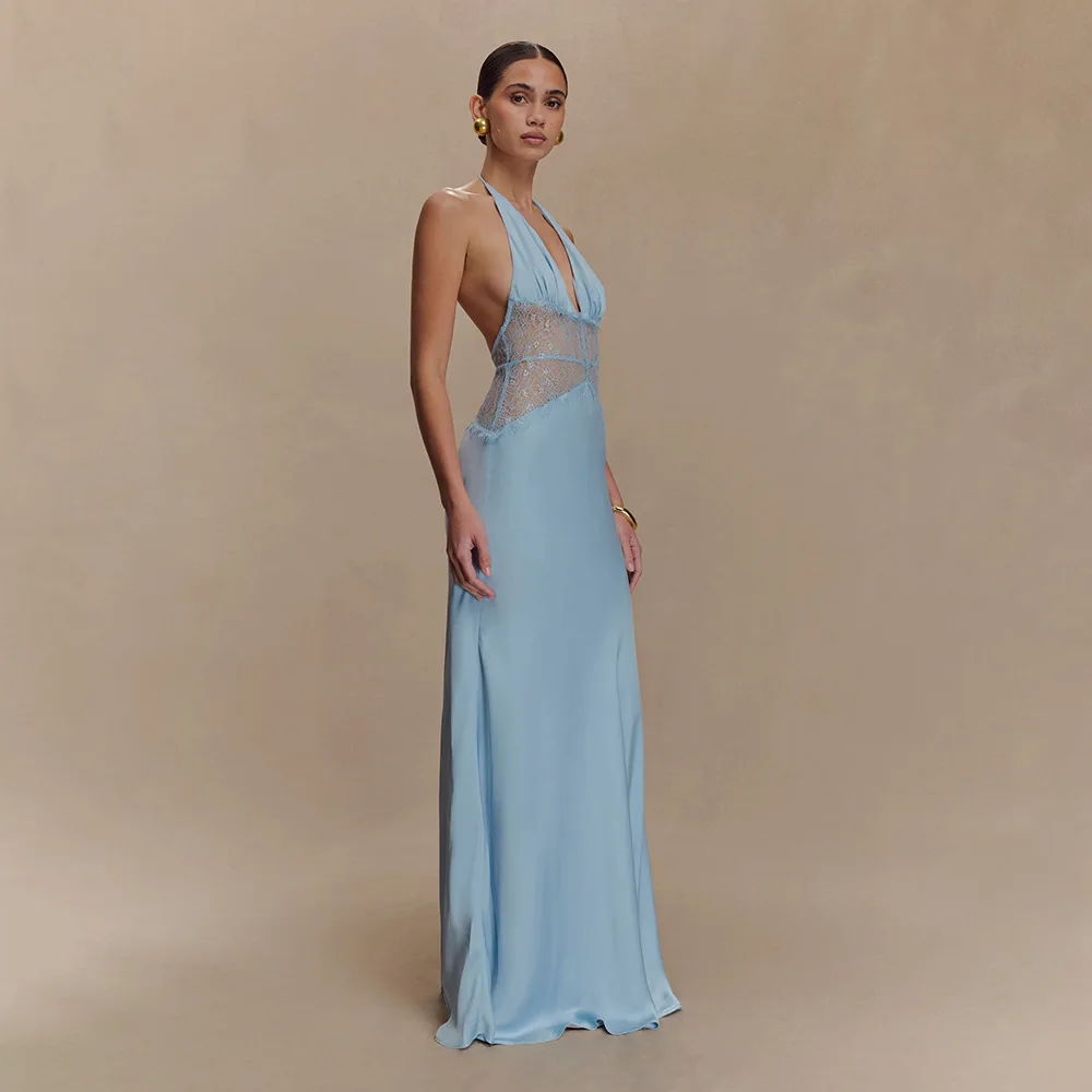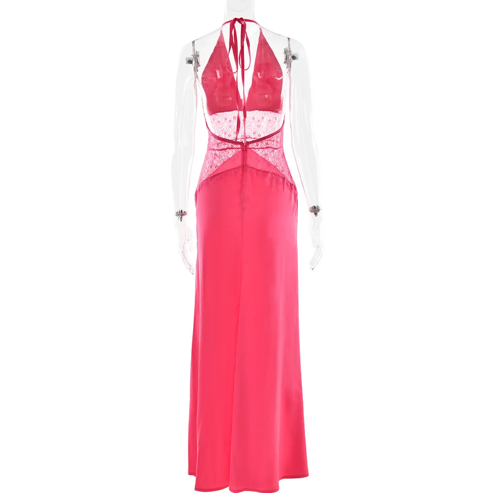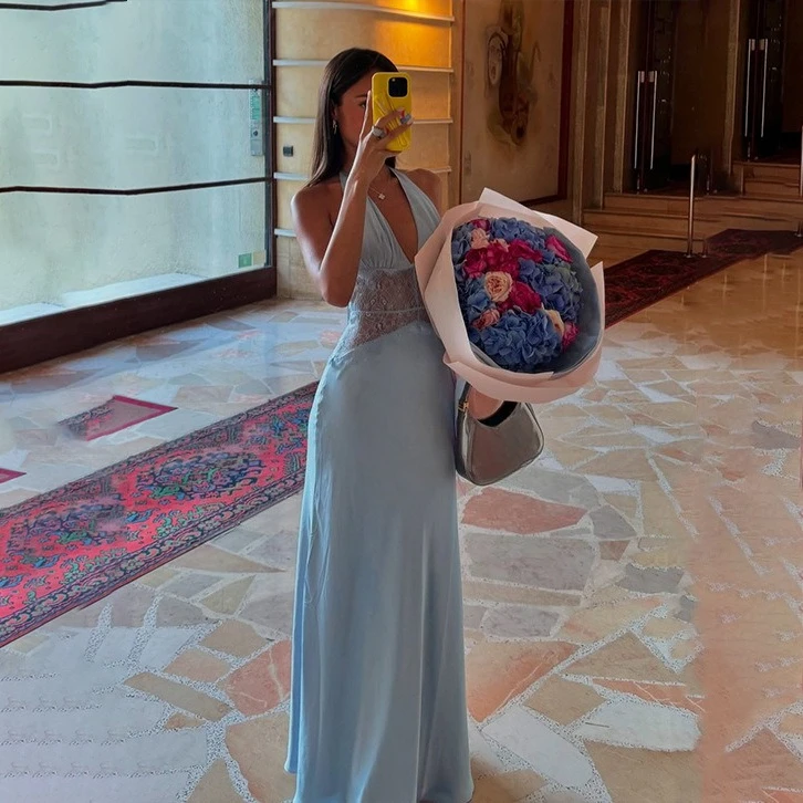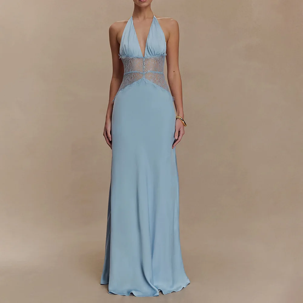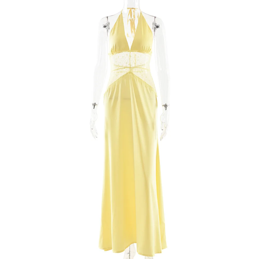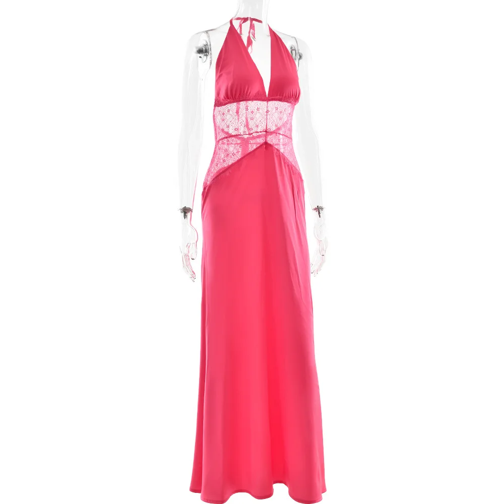 Sexy Deep V-neck Backless Lace Patchwork Satin Dresses for Women 2025 Summer Halter Sleeveless Long Maxi Party Evening Dress