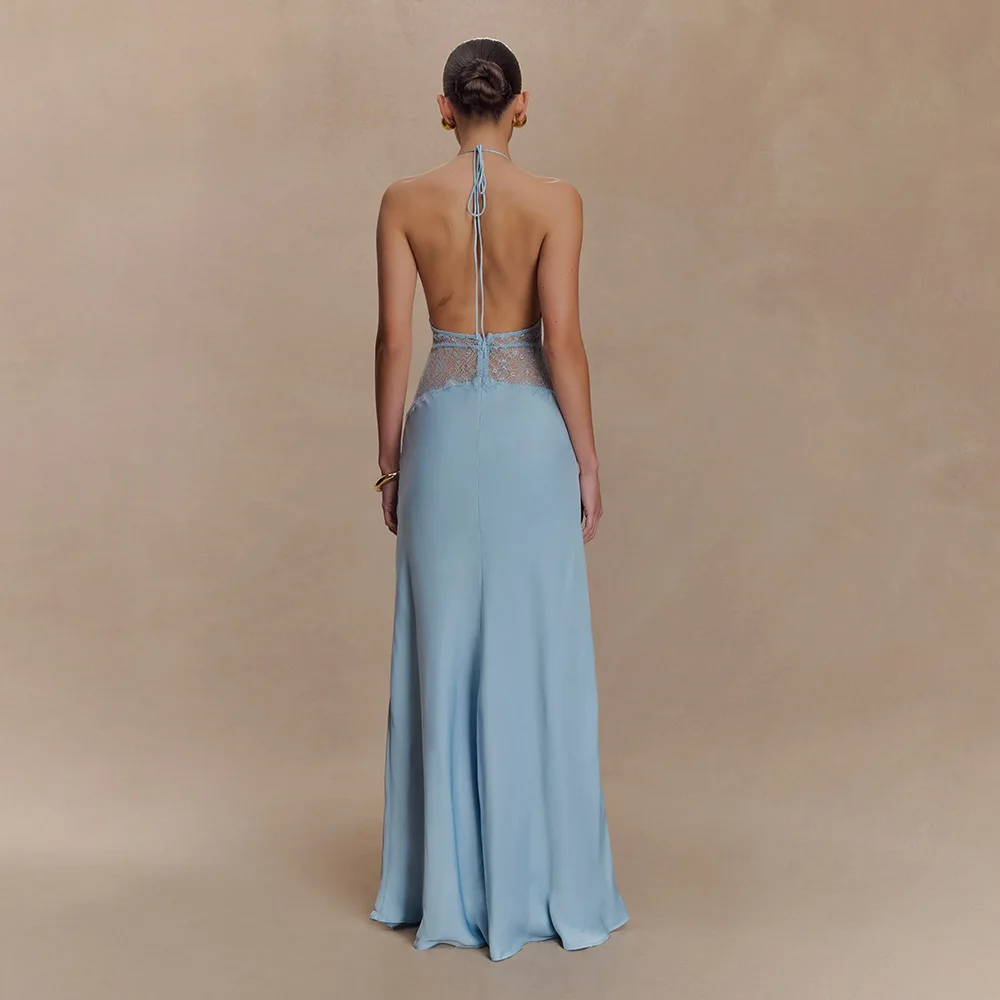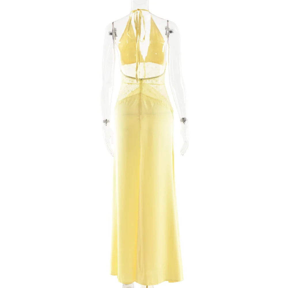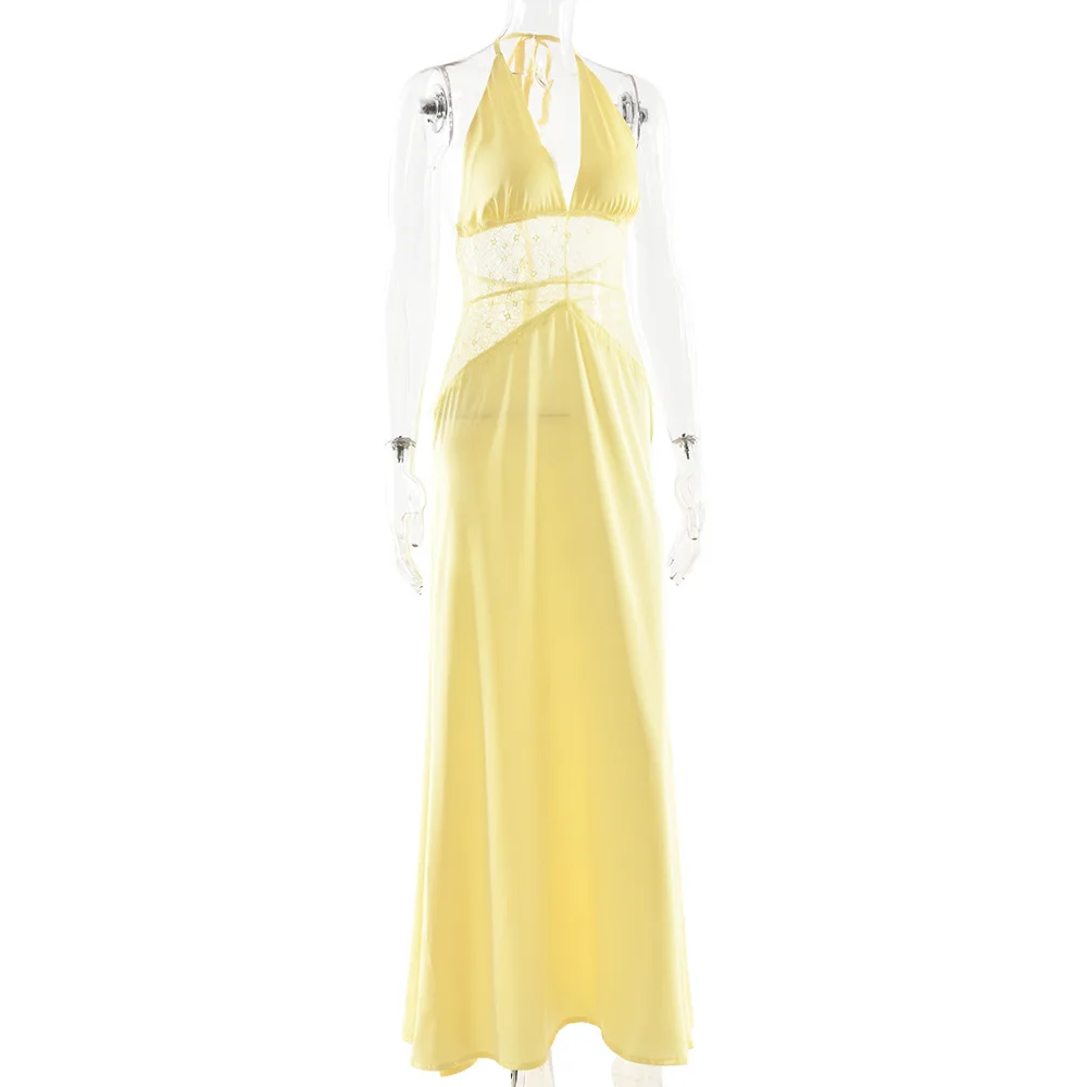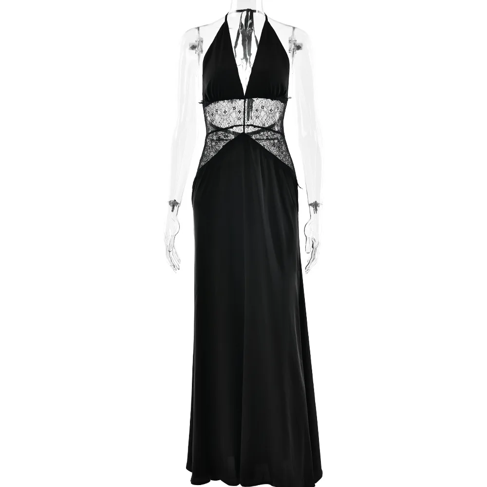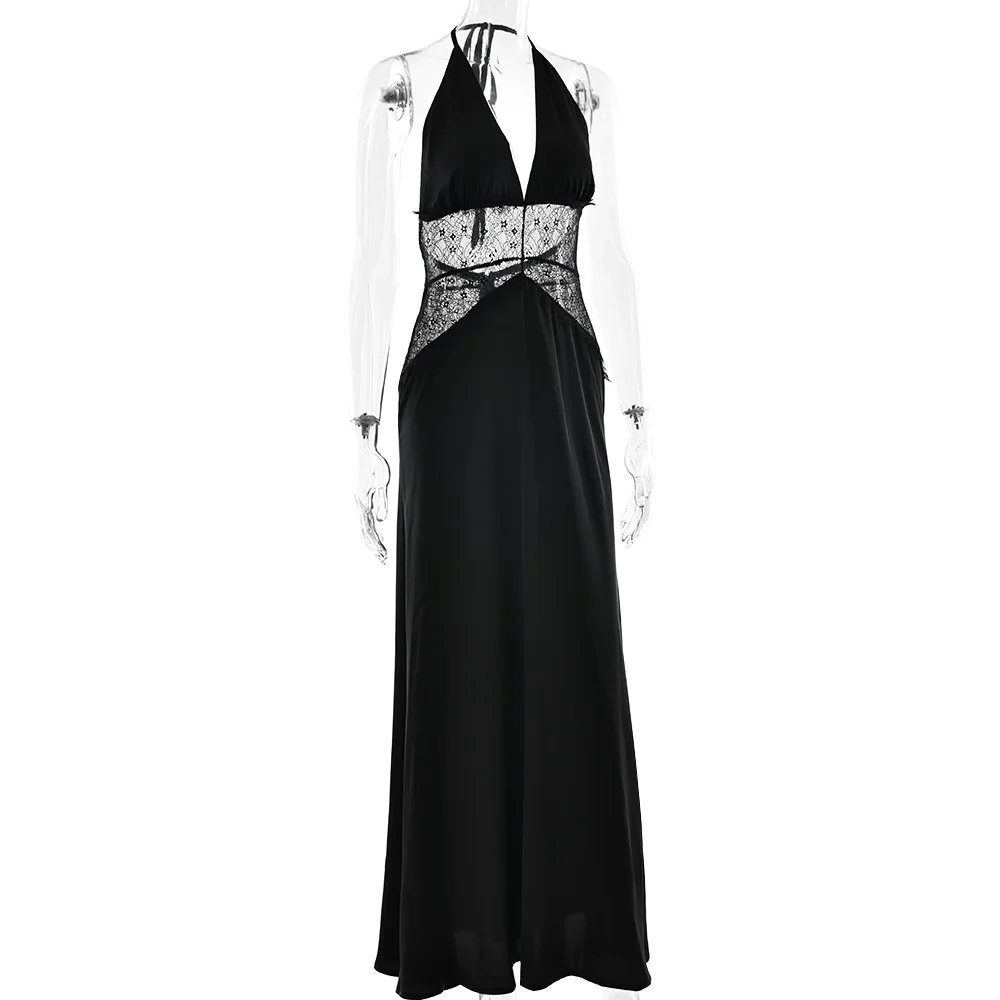 Sexy Deep V-neck Backless Lace Patchwork Satin Dresses for Women 2025 Summer Halter Sleeveless Long Maxi Party Evening Dress
